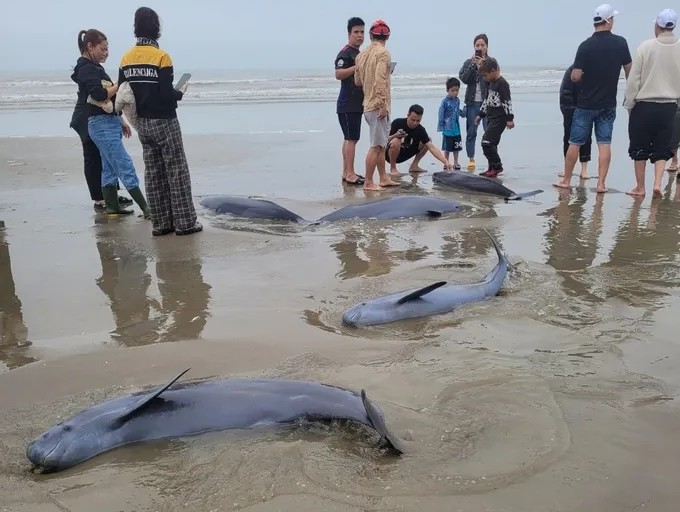 Hình ảnh đàn cá heo mắc lưới, dạt vào bờ biển tỉnh Hà Tĩnh vào năm 2024, đang sống khỏe mạnh sau đó được người dân thả về biển khơi. (Ảnh Sưu tầm)
