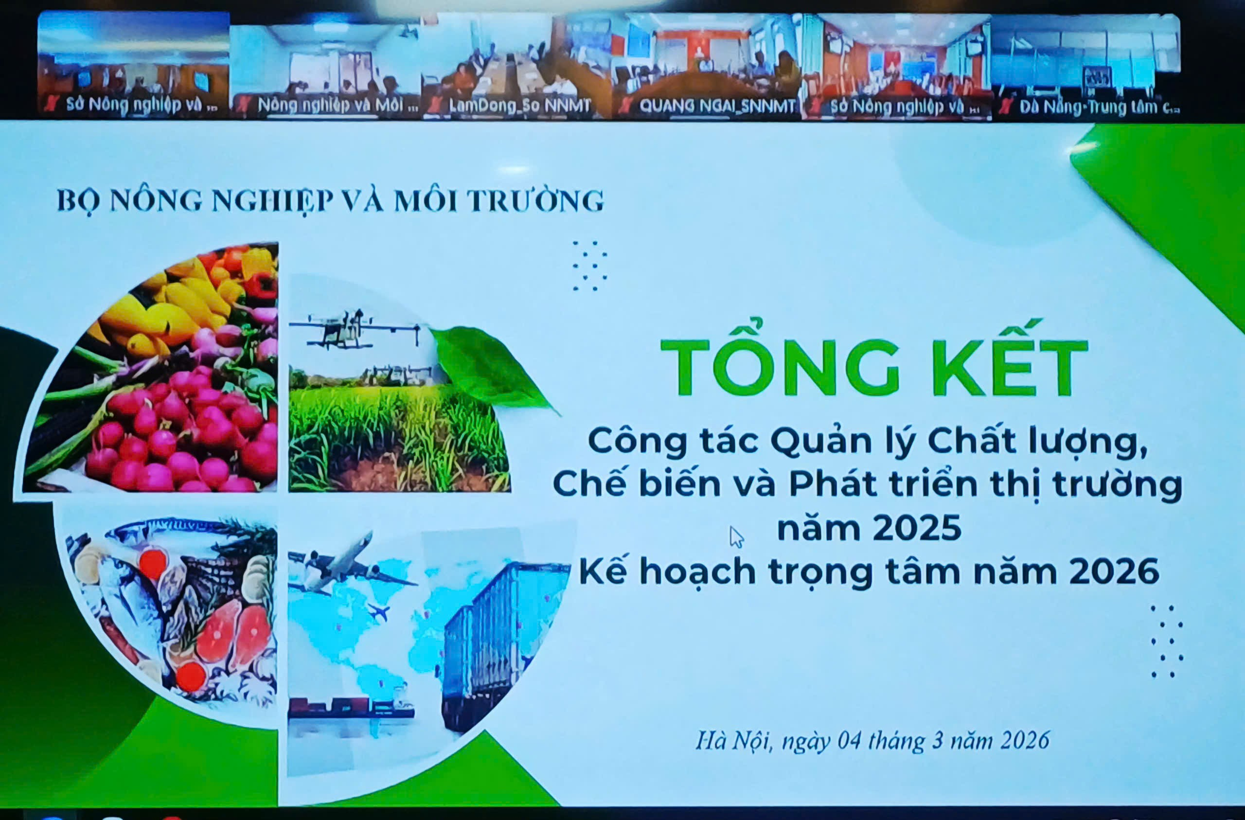Ngày 04/3/2026, Bộ Nông nghiệp và Môi trường tổ chức Hội nghị tổng kết công tác quản lý chất lượng, an toàn thực phẩm, chế biến và phát triển thị trường nông lâm thủy sản năm 2025; đồng thời triển khai kế hoạch hành động năm 2026. Hội nghị do ông Trần Thanh Nam - Thứ trưởng Bộ Nông nghiệp và Môi trường chủ trì, với sự tham dự của đại diện các đơn vị trực thuộc Bộ, các hiệp hội ngành hàng, doanh nghiệp, cùng lãnh đạo các Sở Nông nghiệp và Môi trường các tỉnh, thành phố trên cả nước.